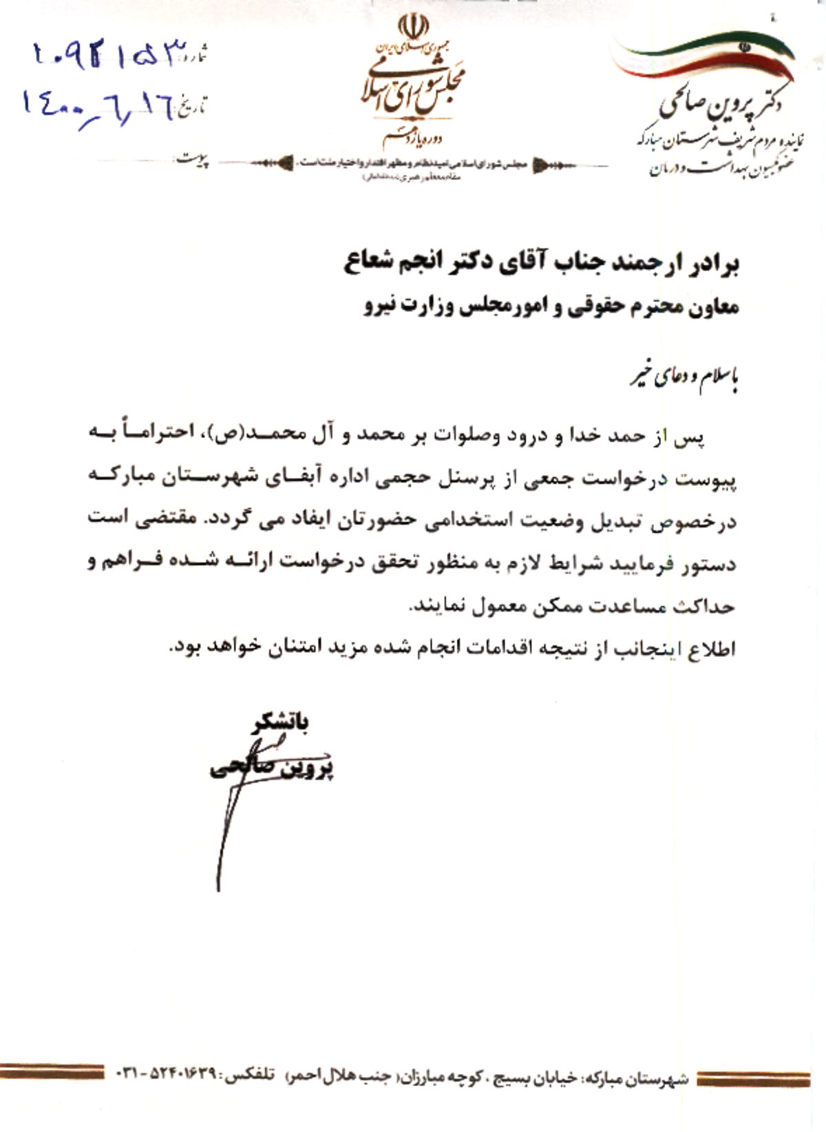 به گزارش پایگاه اطلاع رسانی دفتر نماینده شهرستان مبارکه، دکتر صالحی، نماینده مردم شهرستان مبارکه در مجلس شورای اسلامی در نامهای درخواست پرسنل اداره آبفای شهرستان برای تبدیل وضعیت استخدامی را به وزارت نیرو انتقال داد و خواستار رفع مشکلات آنها شد.