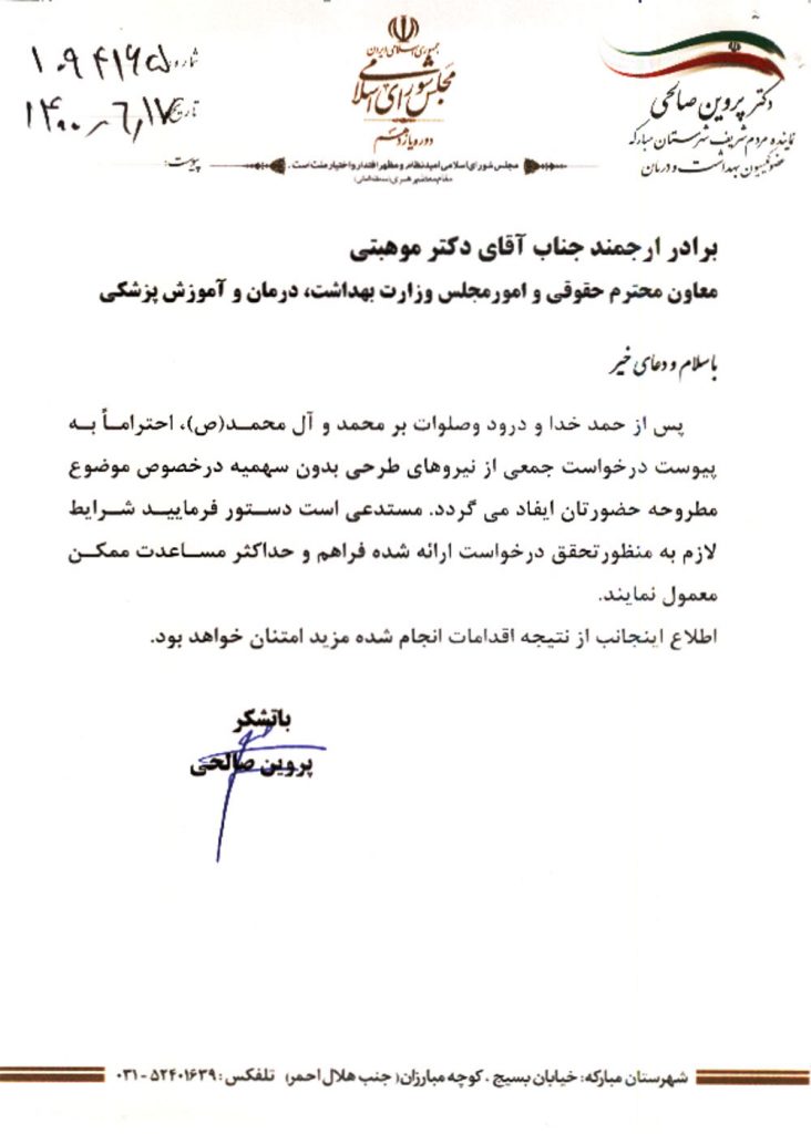 به گزارش پایگاه اطلاع رسانی دفتر نماینده شهرستان مبارکه، دکتر صالحی، نماینده مردم شهرستان مبارکه در مجلس شورای اسلامی در نامهای وزارت بهداشت درخواست استخدام جمعی از نیروهای «طرحی بدون سهمیه» وزارت بهداشت و درمان را انتقال داد و خواستار رسیدگی به درخواست آنها شد.